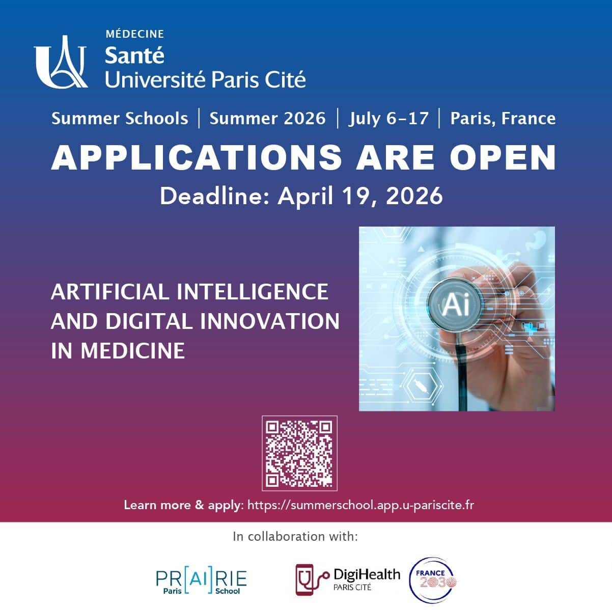 Université Paris Cité (UPCité) Medical School presents an intensive 2-week long summer program entirely in English focused on cutting-edge AI and digital healthcare solutions. Discover how artificial intelligence (AI) and digital innovation are revolutionizing healthcare through a balanced curriculum of morning lectures and afternoon hands-on workshops.